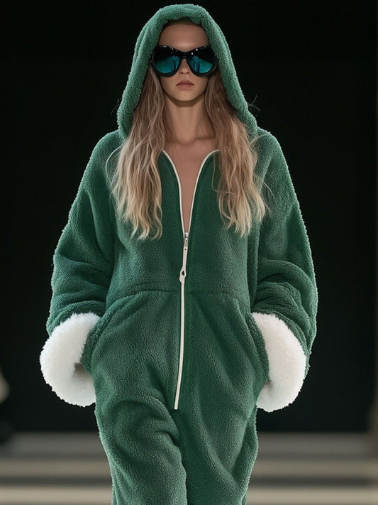 24-Hour Shipping: Relaxed Fit Retro Green Velvet Jumpsuit with Long Sleeves and Zip Closure