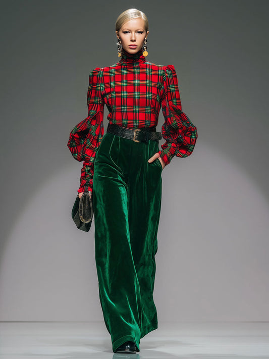 Chic Retro Check Velvet Turtleneck with Long Sleeves and Wide-Leg Pants