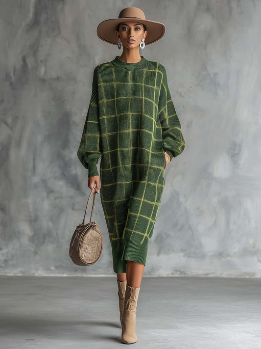 Retro Comfort Green Check Midi Dress with Round Neck