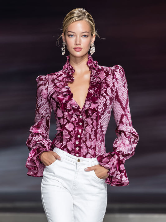 Chic Retro Snake Print Ruffled Shirt in Purple-Red Velvet with Long Sleeves