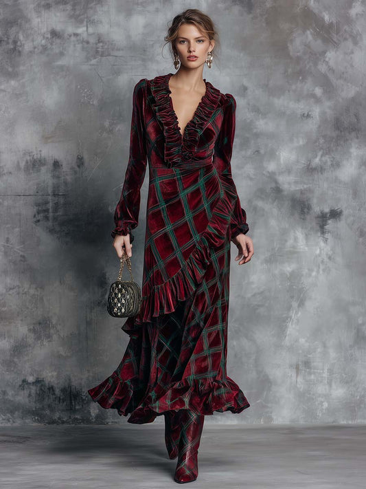 Chic Green Check Maxi Dress with Ruffles, V-Neck, and Burgundy Velvet Accents