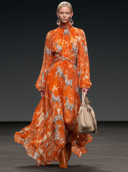 Retro-Inspired Orange Chiffon Maxi Dress with Long Sleeves and High Collar