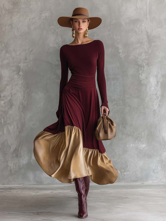 Chic Vintage-Inspired Maxi Dress with Round Neckline, Gold Satin Skirt, and Burgundy Stretch Cotton Bodice