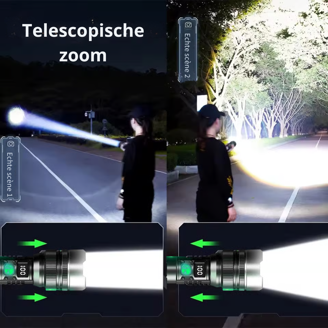 Super Bright LED + Zoom Function: Adjustable beam for wide overview or sharp detail.